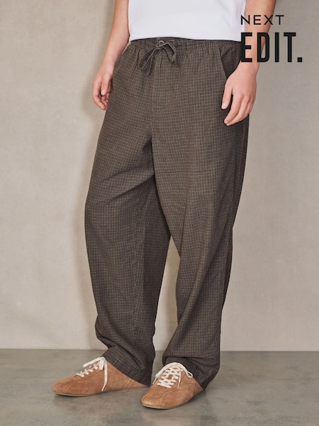 بني - EDIT Baggy Fit Linen Rich Checkered Trousers With Elasticated Waist