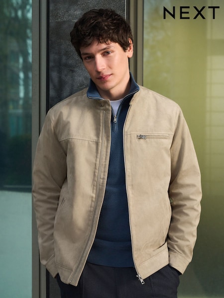 لون محايد - سترة خفيفة بياقة وسحّاب كامل من القماش السويدي الصناعي