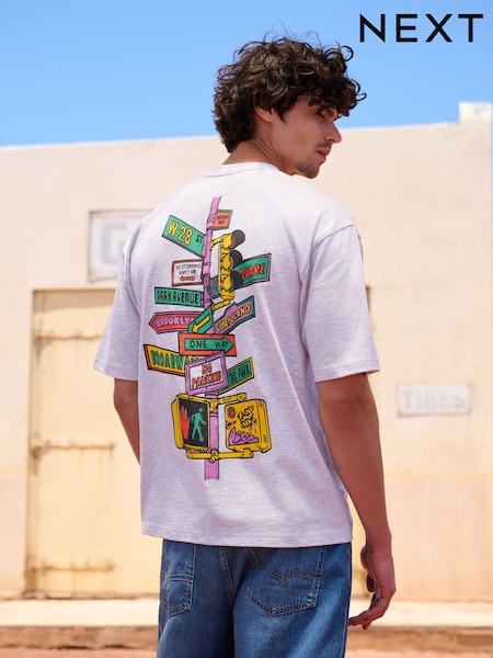 رمادي - قياس انسيابي - تيشرت ثقيل الوزن بطبعة جرافيك