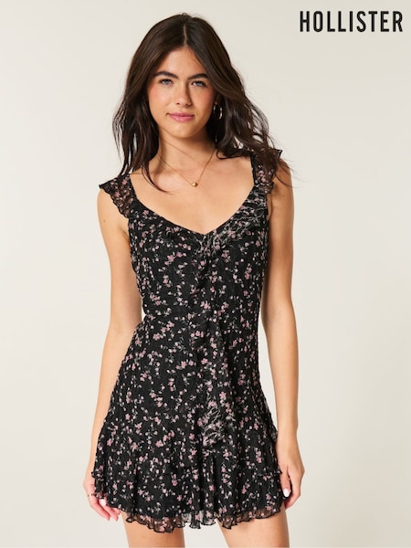 أسود - فستان قصير بياقة V مع كشكشة دانتيل من Hollister