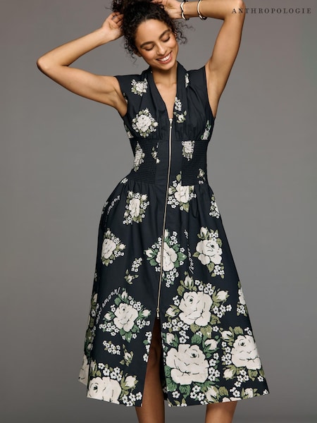 أسود - فستان بتصميم قميص متوسط الطول بسحّاب أمامي تصميم مجمع أكمام فوق الكتف The Tommie من Anthropologie