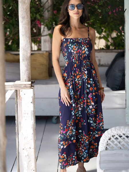 كحلي زهور متعدد الألوان - فستان شاطئي ماكسي منسوج بدون أكمام مع توب مجمّع من Pour Moi موديل Emma