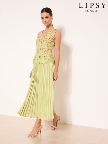 فستان متوسط الطول 2 في 1 بتنورة مطوية وتصميم هجين من الدانتيل من Lipsy Premium