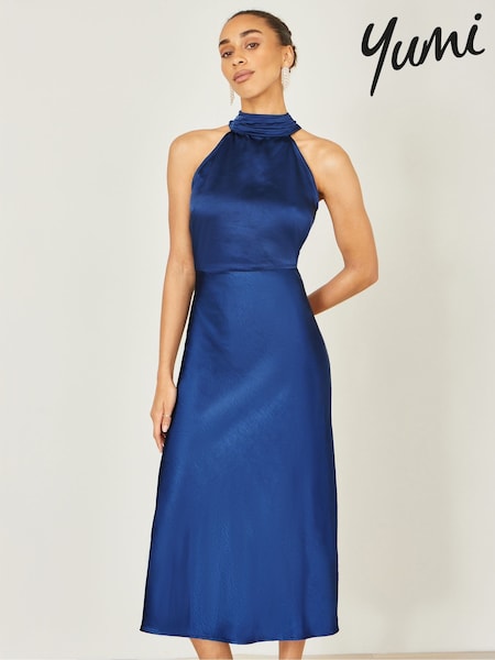 أزرق - فستان متوسط الطول ستان برقبة كبيرة من Yumi