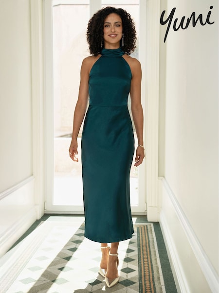 أخضر - Yumi Satin Halter Neck Midi Dress