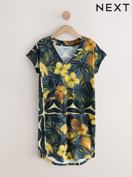 مشجر مطبوع - فستان قصير قطن بفتحة رقبة حرف V وأكمام فوق الكتف