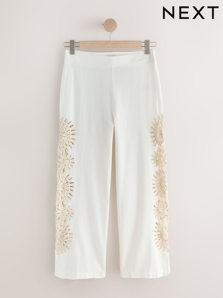 بيج فاتح - Crochet Insert Wide Leg Lightweight Trousers With Linen