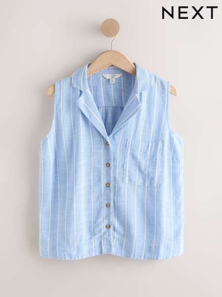 مقلم أزرق/أبيض - Revere Collar Sleeveless Shirt with Linen