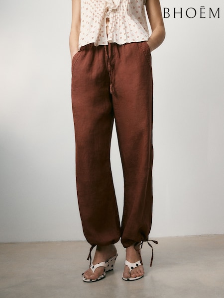 بني مائل للأحمر - محايد ـ بنطلون كتّان 100% برِجل واسعة بتفصيل رباط من BHOEM