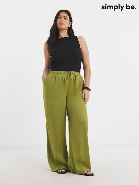 أخضر - بنطلون من مزيج الكتان برباط على الخصر وبرِجل واسعة من Simply Be