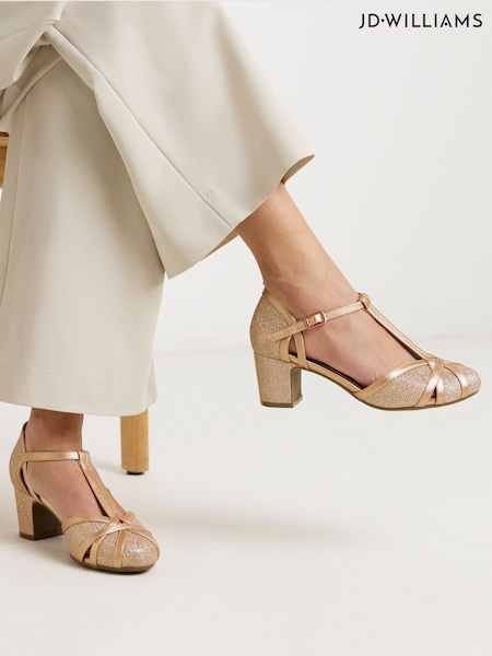 JD Williams Gold Wide Fit Heeled T Bar Shoes