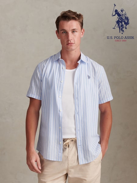 U.S. Polo Assn. Blue Linen Blend Summer Stripe Short Sleeve Shirt