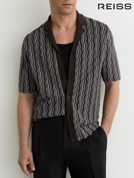 Reiss Brown Drake Wavy-Stripe Cuban-Collar Knit Shirt