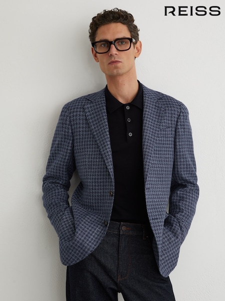 Reiss Navy Romana Wool-Blend Single-Breasted Check Blazer With Linen