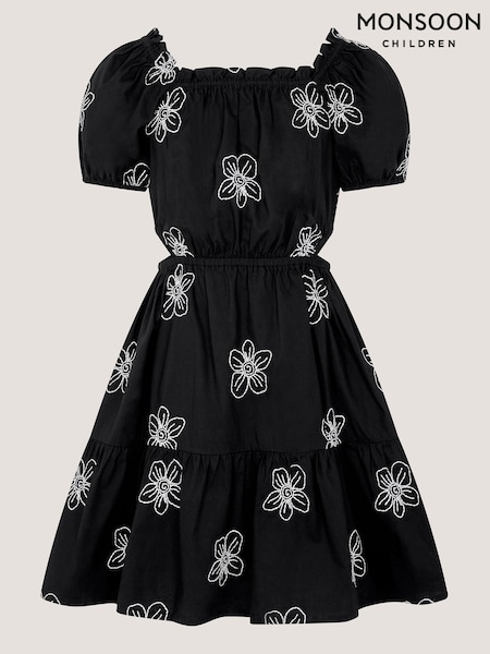 Monsoon Black Puff Sleeve Floral Embroidered Dress