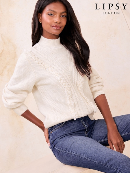 Lipsy White Cable Knitted Fringe Detail Long Sleeves Crew Neck Jumper