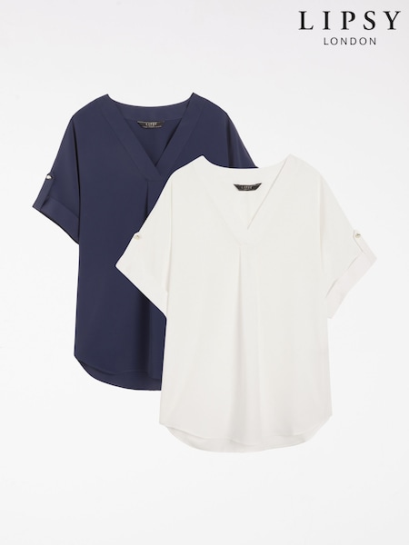 Lipsy White/Blue Utility V-Neck Short Roll Sleeve Tops 2 Pack