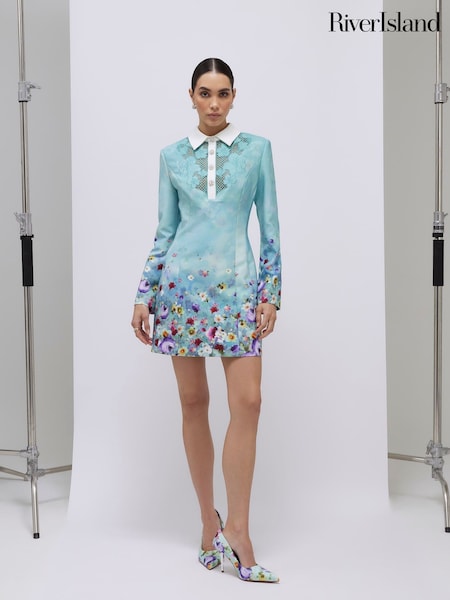 River Island Blue Long Sleeve Floral Print Mini Dress