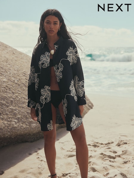 Black / Ecru Foral Embroidered Beach Shirt