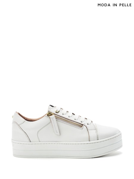Moda in Pelle White Abbee Leather Slab Sole Lace Up Trainers With Zip