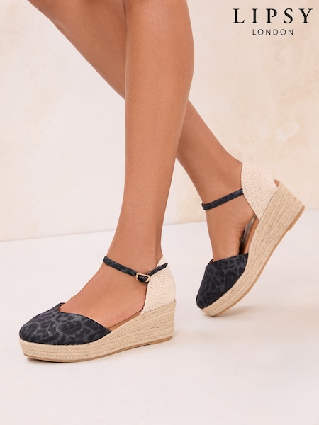 Lipsy Black Leopard Wide Fit Closed Toe Summer Espadrille Wedge Heels