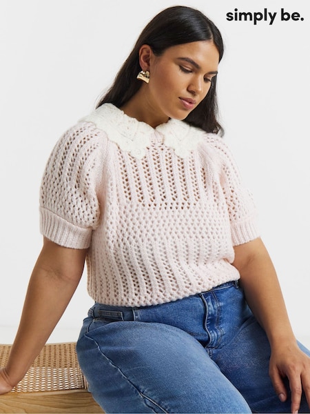 Simply Be Pink Pointelle Collar Puff Sleeve Jumper