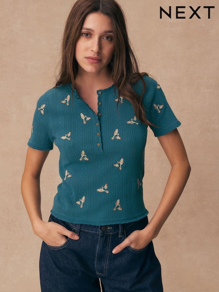 Teal Blue Bird Embroidered Pointelle Henley T-Shirt