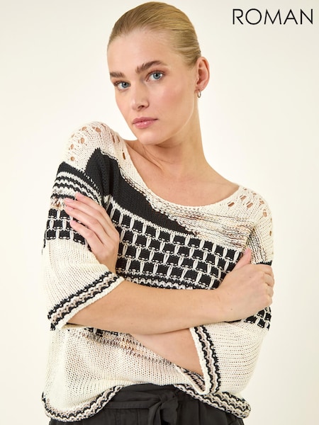 Mint Velvet White Striped Knit Denim Detail Jumper