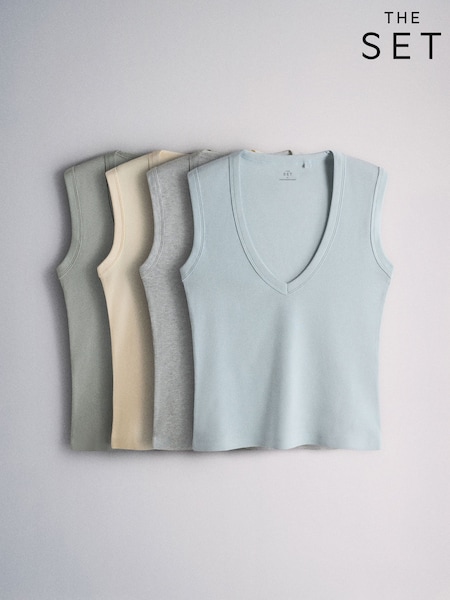 The Set Deep V-Neck Ribbed Vests 4 Pack Pale Blue/Pastel Yellow/Grey