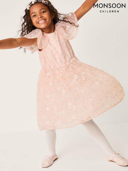 Monsoon Pink Romee Puff Sleeve Embroidered Party Dress